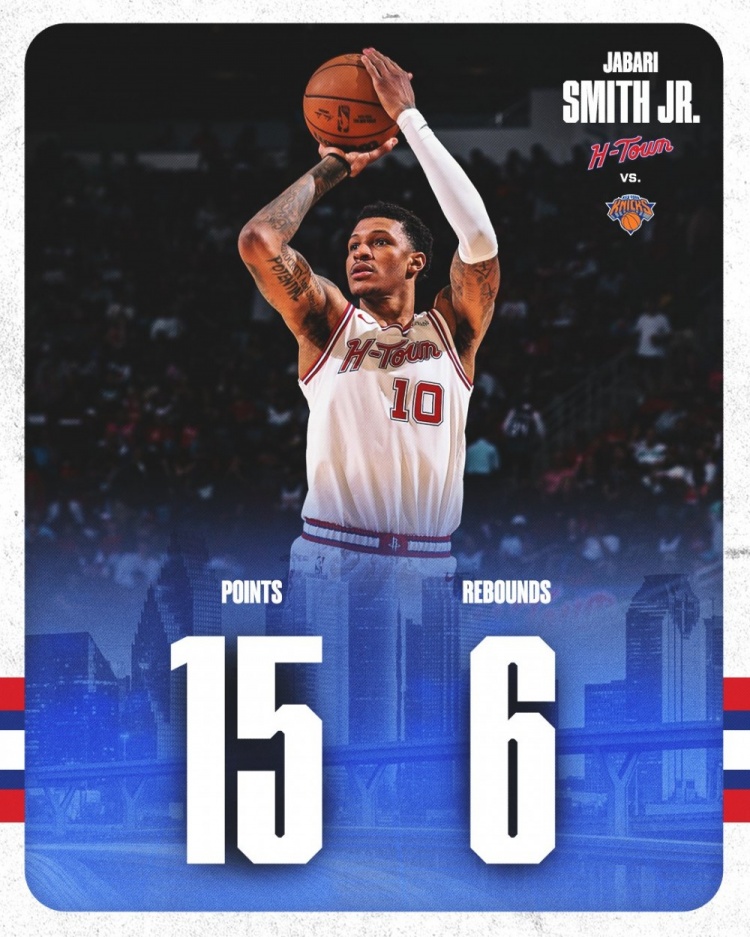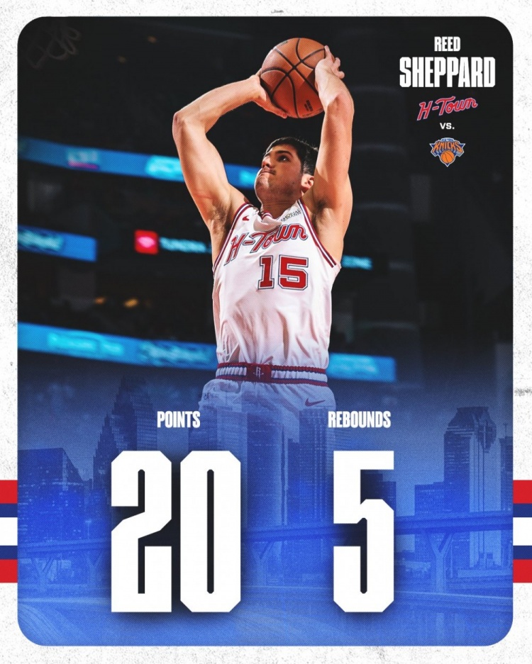 赛后火箭官方发布数据海报,包括五个首发和第六人谢泼德。
